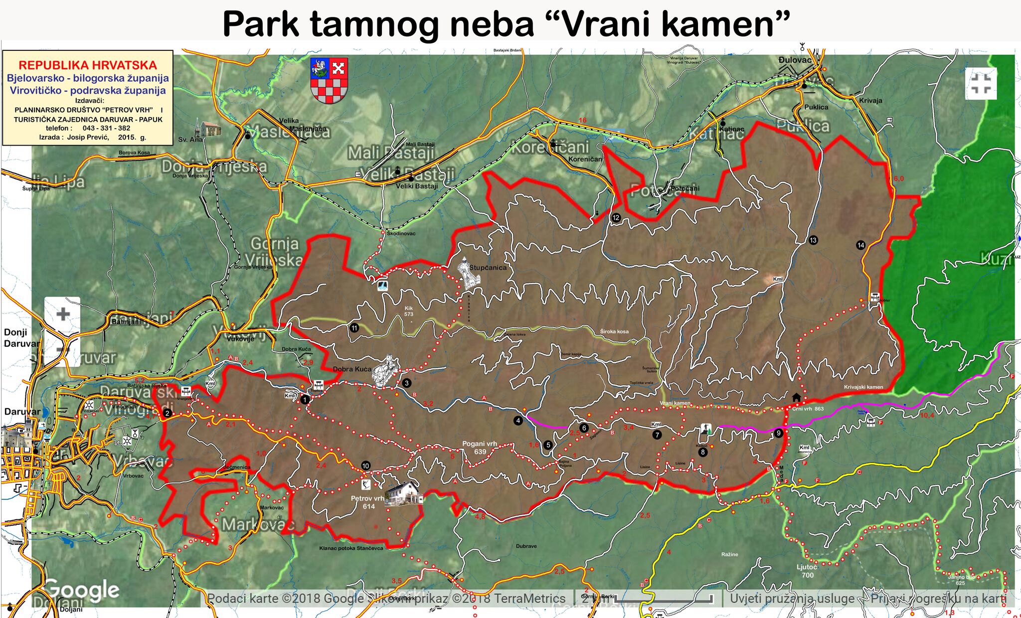 Međunarodni park tamnog neba Vrani kamen nalazi se na teritoriju Republike Hrvatske u neposrednoj blizini grada Daruvara i proteže se na površini od 8000 hektara zapadnog dijela planine Papuk. Većim dijelom njime upravljaju Hrvatske šume, dok je područje Petrovog vrha pod upravom grada Daruvara.